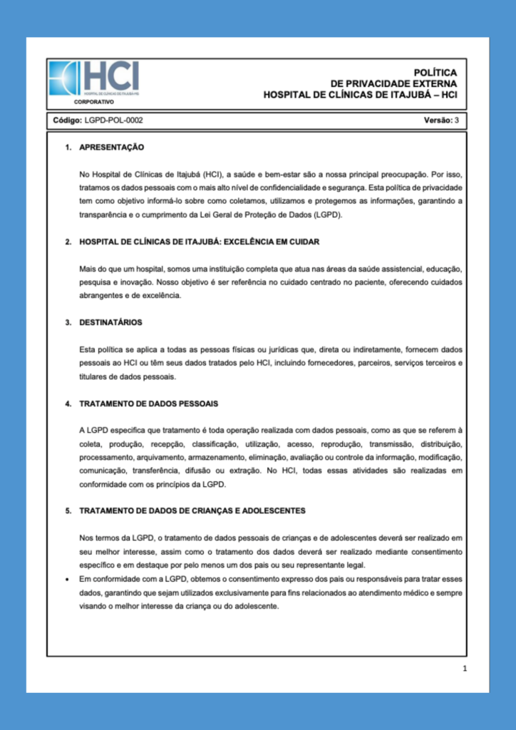 O HCI adota código de ética e políticas institucionais de integridade, combate à fraude e à corrupção, gestão de riscos, privacidade e proteção de dados pessoais, alinhados às normas brasileiras e aos requisitos de acreditação hospitalar. Esses documentos orientam a conduta de colaboradores, corpo clínico, parceiros e fornecedores.